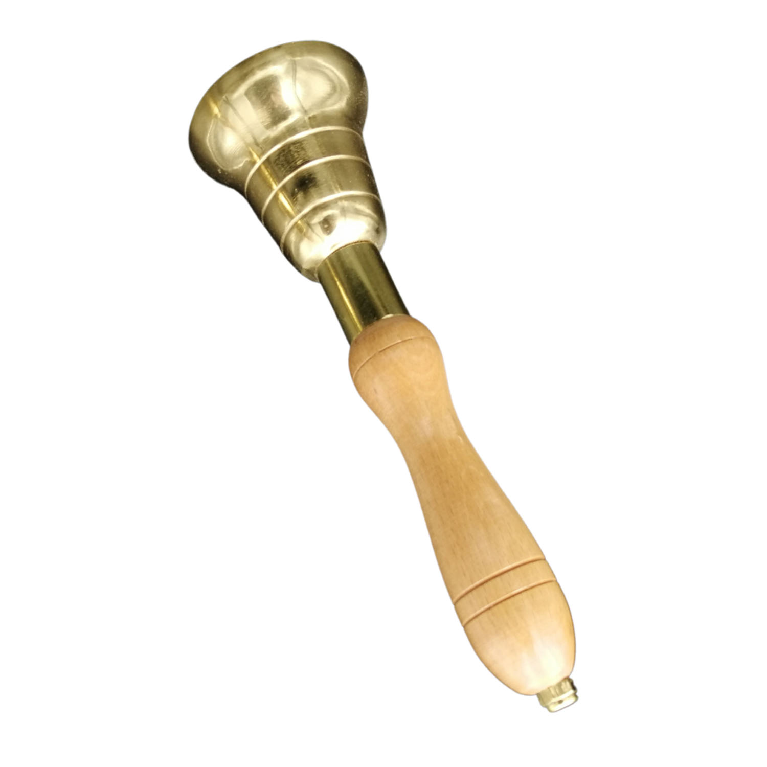 Pirinç, bakır ve çinko madenlerinin birleşiminden oluşan dayanıklı bir alaşımdır. Bu el çanı, pirinç döküm yöntemiyle üretilmiştir ve ardından taşlama, polisaj işlemleriyle mükemmel bir yüzey elde edilmiştir. Ürünün ömrünü uzatmak ve dayanıklılığını artırmak için vernik, kaplama ve fırın boya işlemleri uygulanmıştır.