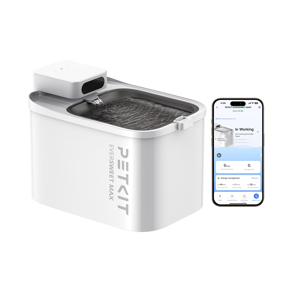 Petkit Eversweet Max, kedi ve küçük köpekler için tasarlanmış akıllı bir su pınarıdır. Ürün 3 litre (101 oz) su kapasiteli geniş bir hazneye sahiptir, bu sayede sık su doldurmaya gerek kalmadan birden fazla evcil hayvanın su ihtiyacını karşılayabilir. Kablosuz (pil ile çalışan) tasarımı, cihazın ev içinde priz kısıtlaması olmaksızın yerleştirilmesine imkân tanır; tam şarjlı pille yaklaşık 83 güne kadar kesintisiz çalışabilir. Pompa ultra sessiz (26 dB civarı) bir motora sahiptir, böylece evcil hayvanınız su içerken huzurunuz bozulmaz.